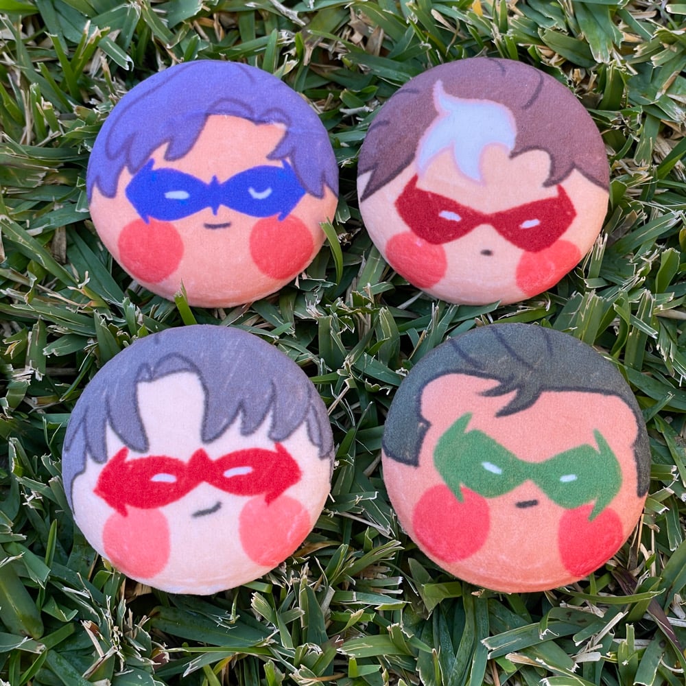 Batfam plush badges (Dick Grayson, Jason Todd, Tim Drake, Damian Wayne)